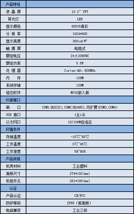 TPC1061Ti(TX),是一套以先進的Cortex-A8 CPU為核心(主頻600MHz)的高性能嵌入式一體化觸摸屏。該產品設計采用了10.2英寸高亮度TFT液晶顯示屏(分辨率1024×600),四線電阻式觸摸屏(分辨率4096×4096)。同時還預裝了MCGS嵌入式組態軟件(運行版),具備強大的圖像顯示和數據處理功能。