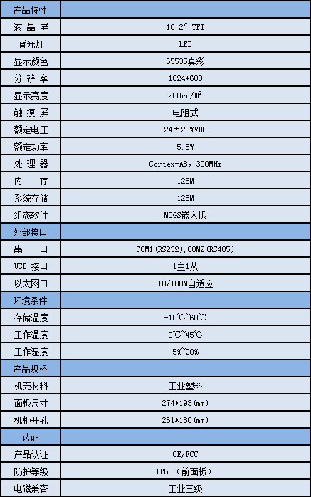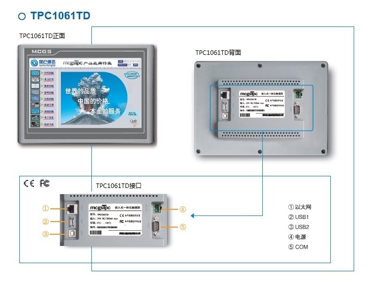 TPC1061TD,是一套以先進的Cortex-A8 CPU為核心(主頻300MHz)的高性能嵌入式一體化觸摸屏。該產品設計采用了10.2英寸高亮度TFT液晶顯示屏(分辨率1024×600),四線電阻式觸摸屏(分辨率4096×4096)。同時還預裝了MCGS嵌入式組態軟件(運行版),具備強大的圖像顯示和數據處理功能。