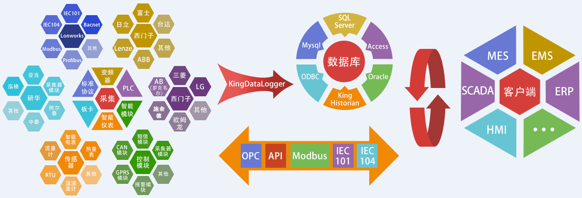 作為亞控產品家族中的數據采集器,KingIOServer可以為KingSCADA與KingHistrian提供數據來源,同時其他第三方的係統也可以通過API接口和OPC(DA和UA)方式訪問實時數據。工程人員可以根據實際工程的需要將KingIOServer進行靈活部署。