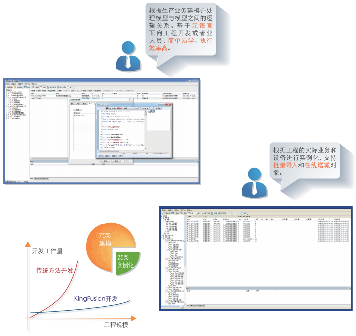 KingFusion3.5平台可以根據行業業務需求,建立各種數據模型、計ji算suan模mo型xing,並bing通tong過guo對dui模mo型xing版ban本ben的de控kong製zhi來lai滿man足zu業ye務wu的de變bian更geng需xu求qiu。在zai模mo型xing階jie段duan完wan成cheng腳jiao本ben邏luo輯ji,在zai工gong程cheng階jie段duan用yong戶hu隻zhi需xu要yao實shi例li化hua自zi己ji的de業ye務wu對dui象xiang。這zhe些xie工gong作zuo隻zhi需xu要yao一yi套taoKingFusion3.5軟件就可以完成,毋需借助其他工具。