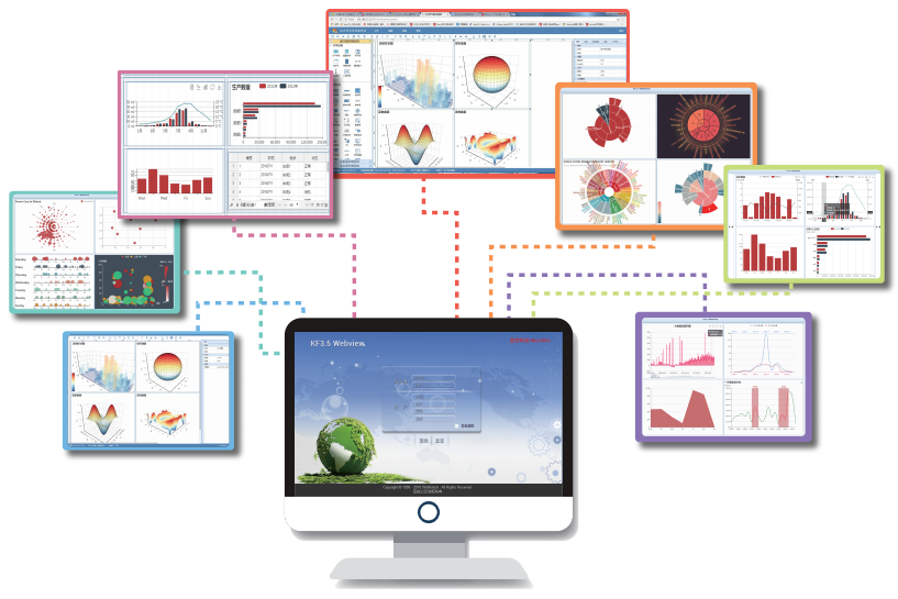 3,客戶端可視化組態方案更豐富 KingFusion3.5提供C/S客戶端和 B/S客(ke)戶(hu)端(duan)。客(ke)戶(hu)端(duan)即(ji)支(zhi)持(chi)靜(jing)態(tai)畫(hua)麵(mian)的(de)開(kai)發(fa),又(you)支(zhi)持(chi)動(dong)態(tai)創(chuang)建(jian)圖(tu)形(xing)對(dui)象(xiang)的(de)功(gong)能(neng),即(ji)能(neng)滿(man)足(zu)一(yi)般(ban)性(xing)畫(hua)麵(mian)組(zu)態(tai)需(xu)求(qiu),又(you)能(neng)滿(man)足(zu)生(sheng)產(chan)企(qi)業(ye)中(zhong)經(jing)常(chang)變(bian)化(hua)的(de)動(dong)態(tai)需(xu)求(qiu)。軟(ruan)件(jian)自(zi)帶(dai)一(yi)些(xie)基(ji)礎(chu)圖(tu)形(xing)模(mo)型(xing),包(bao)括(kuo)圖(tu)表(biao)、控件、曲線等,又支持OCX控件, EChart圖表即拖即用,通過組態的方式,完成精美的畫麵設計。用戶通過電腦、平板、手機等多種設備可以查看和操作生產管理係統。