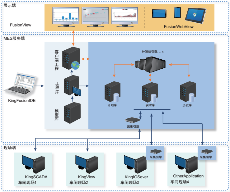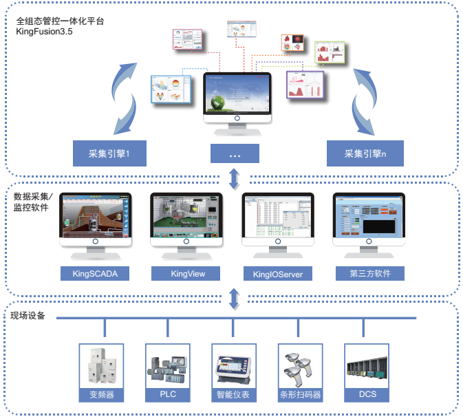 KingFusion產品中的采集引擎,即可以輕鬆接入亞控公司自身的KingView、KingSCADA、 IOServer的數據,也可輕鬆訪問第三方監控軟件或數據采集類軟件中的數據。總之,隻要第三方軟件有通訊接口,KingFusionjiunengshixianhezhexieyingyongchengxudeshujujiaohu。bingqiecaijiyinqingkeanxukuozhan,zhichifenbushibushu,keyishixiandaguimoxiangmuzhongjiwanshenzhijishiwandiandeshengchanxianchangdeshujujieru;並bing支zhi持chi在zai線xian接jie入ru各ge種zhong生sheng產chan數shu據ju和he設she備bei運yun行xing數shu據ju,全quan麵mian實shi現xian即ji時shi感gan知zhi生sheng產chan狀zhuang態tai和he生sheng產chan進jin度du,協xie同tong處chu理li各ge種zhong故gu障zhang,確que保bao生sheng產chan的de可ke持chi續xu和he生sheng產chan任ren務wu的de按an時shi完wan成cheng。