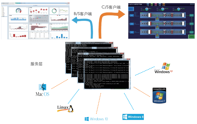 KingFusion3.5後台服務器是由最基本的C++ 語言開發,一套代碼,可以在不同的係統(Windows、Linux、Unix等)下用不同編譯器編譯均可運行。隻需要維護這一套代碼版本,就能夠滿足客戶的不同需求。